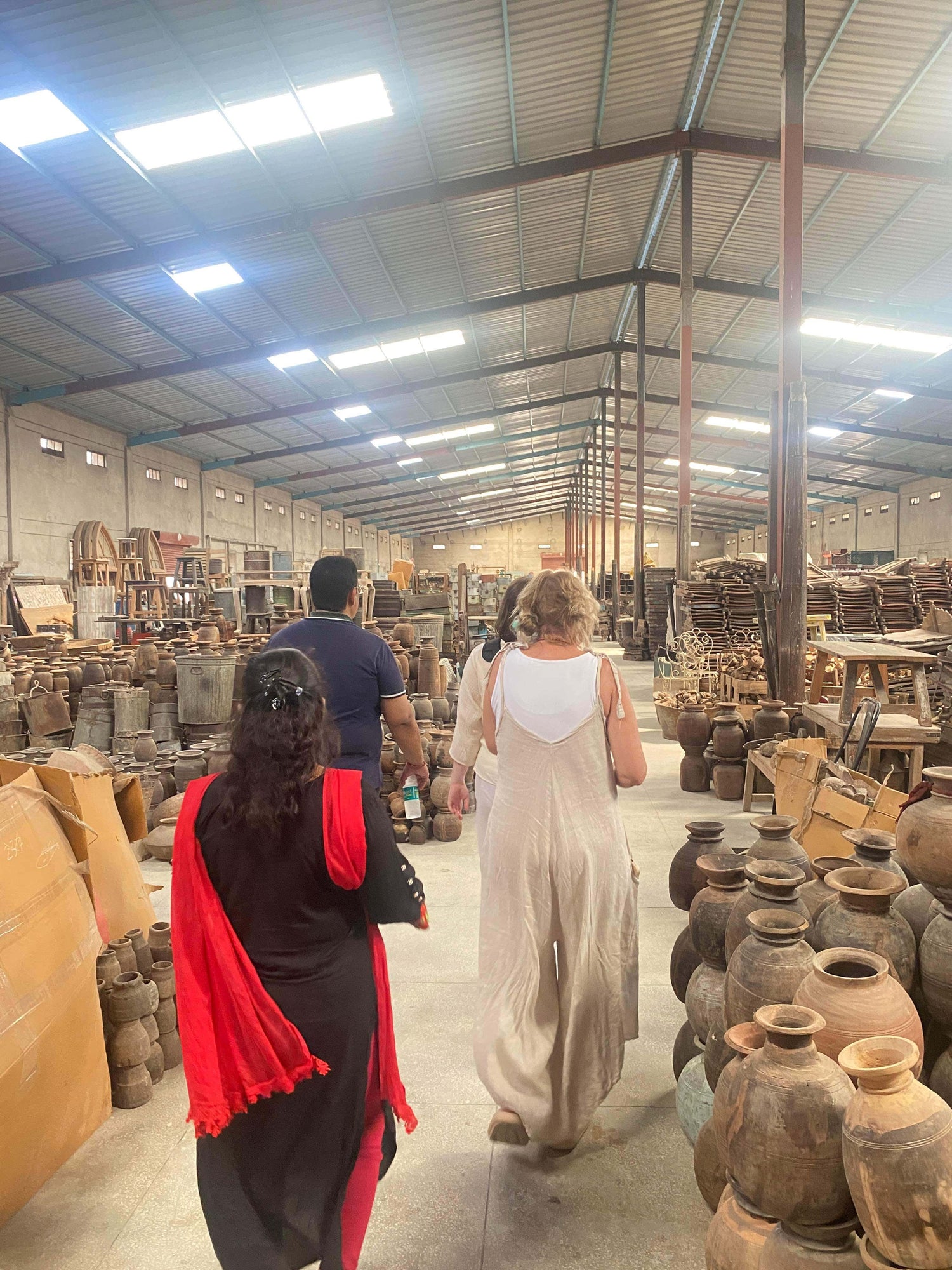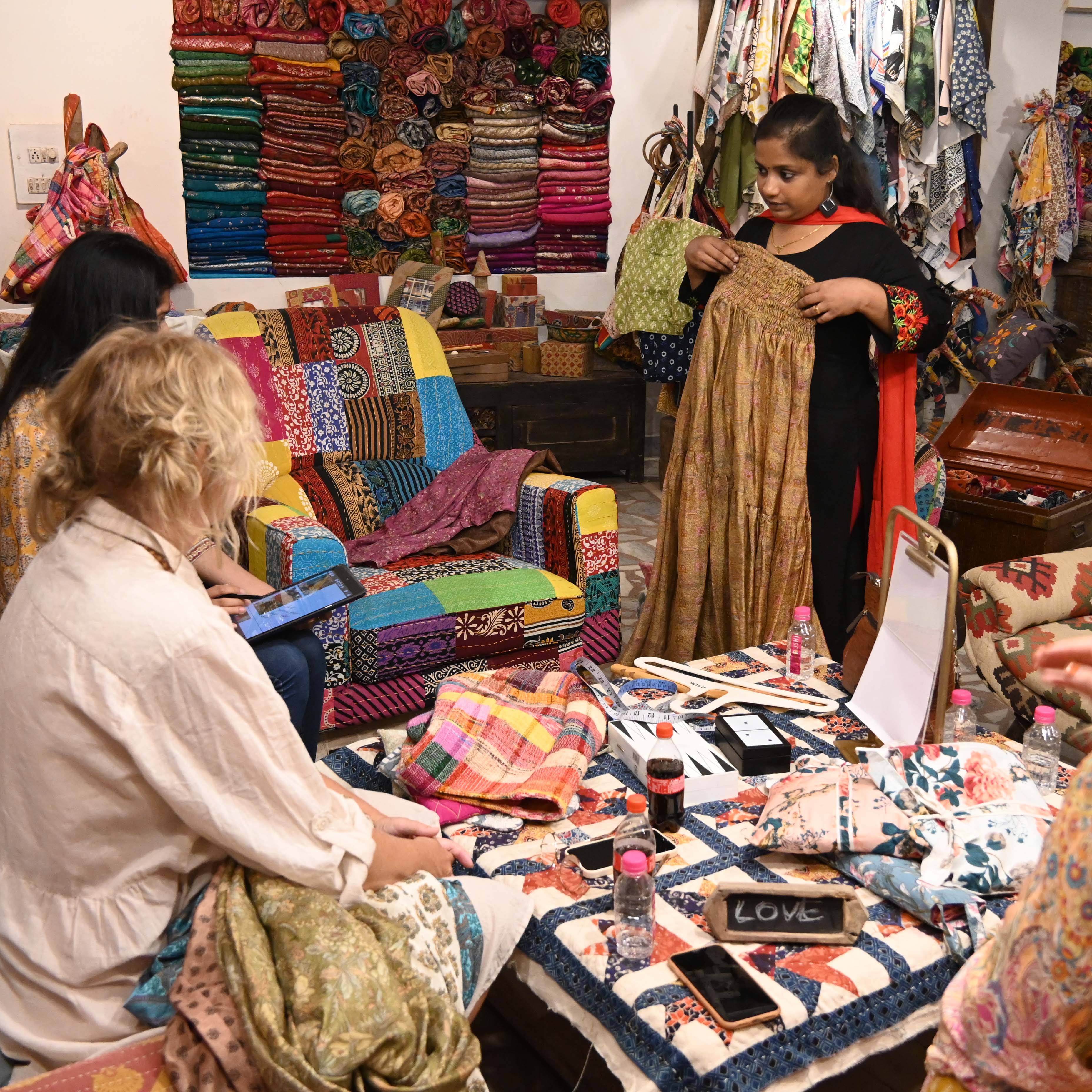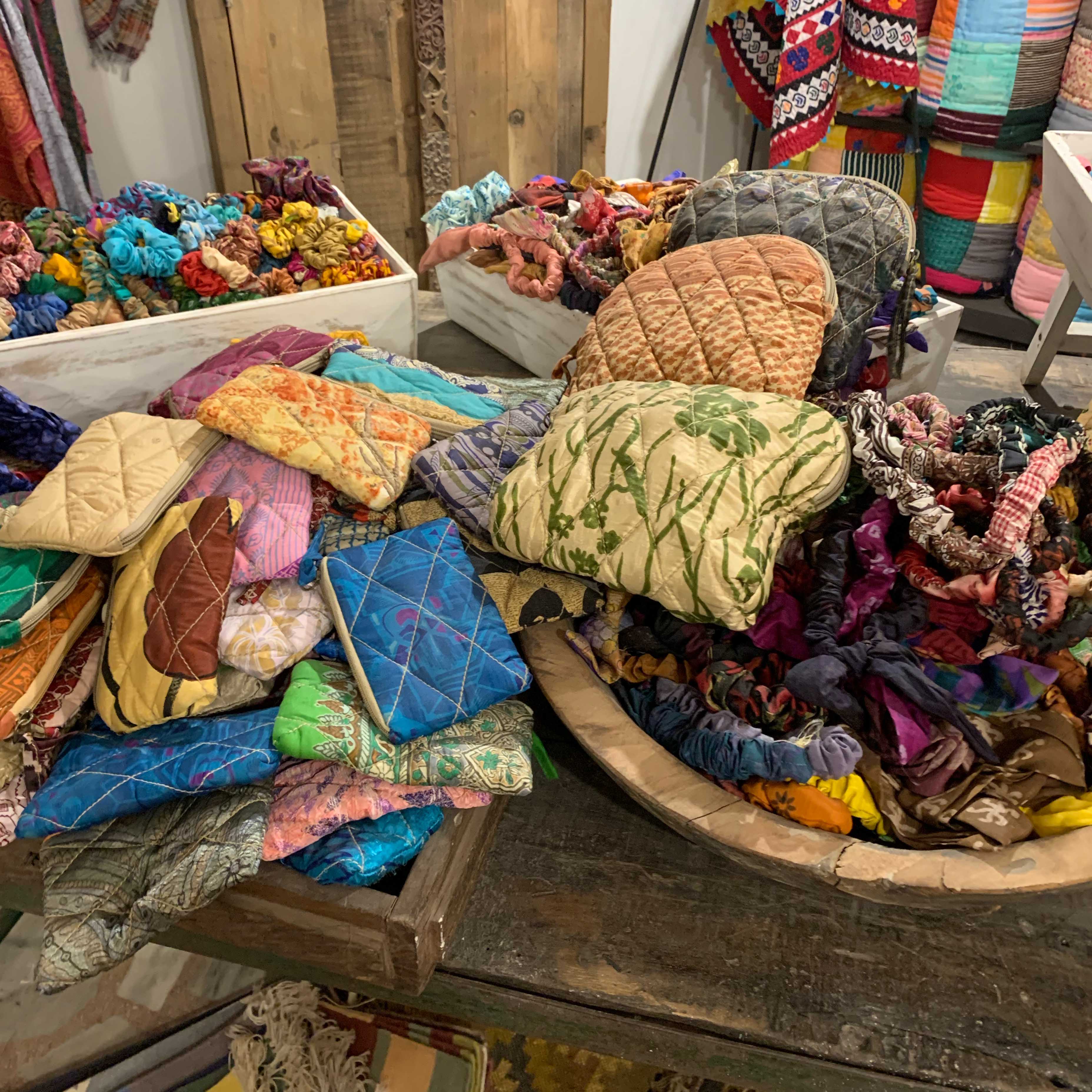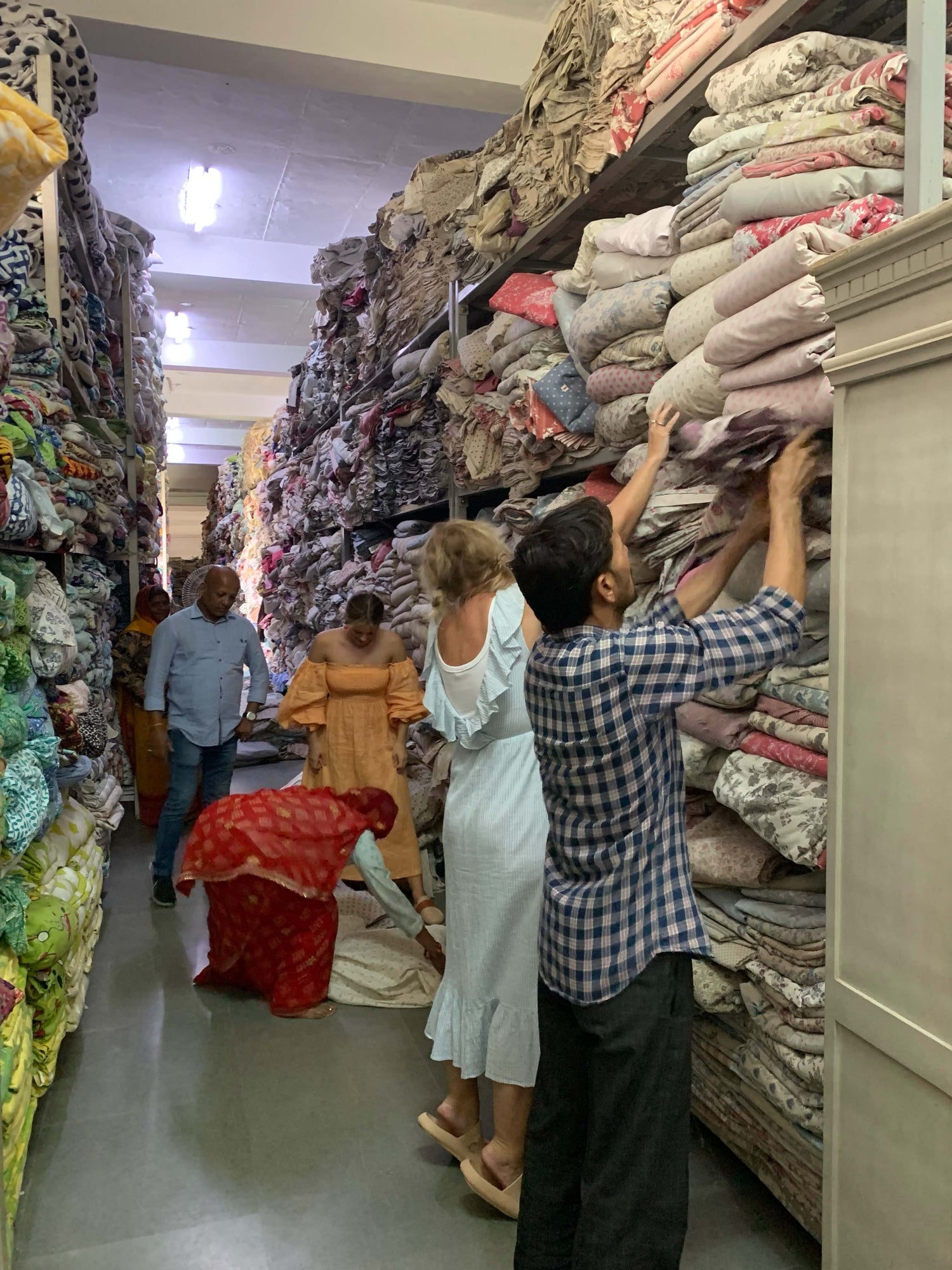 Under våra resor till Indien kliver in i dessa gigantiska hangarer, där färdigproducerade tyger sträcker sig från golv till tak, som en labyrint av möjligheter. Där, bland de bortglömda rullarna och staplarna, ser vi potentialen som andra kanske förbiser. Det är där vi hittar vårt bränsle för kreativitet och förnyelse. När vi först började fråga efter stocklots, eller överproduktion som det kallas, möttes vi av förvåning från våra leverantörer. Ingen av dem hade tidigare haft någon som var intresserad av deras restproduktion på detta sätt. Glädjen som spreds när vi presenterade vår idé var obetalbar. Att se möjligheter är inristat i varje indiskt sinne, liksom konsten att återvinna och ge nytt liv åt det som andra kanske ser som överflöd. Det är en läxa som vi i västvärlden har mycket att lära av. Under åren har vi arbetat med att omvandla dessa resttyger till en mängd olika produkter – från påsar till butiken och påslakan till smycken, sittdynor och kläder. Varje produkt bär med sig en historia av hållbarhet och kreativitet, och vi är otroligt stolta över att kunna erbjuda våra kunder något som inte bara är vackert utan också bär på ett djupt meningsfullt budskap om ansvar och respekt för jordens resurser.