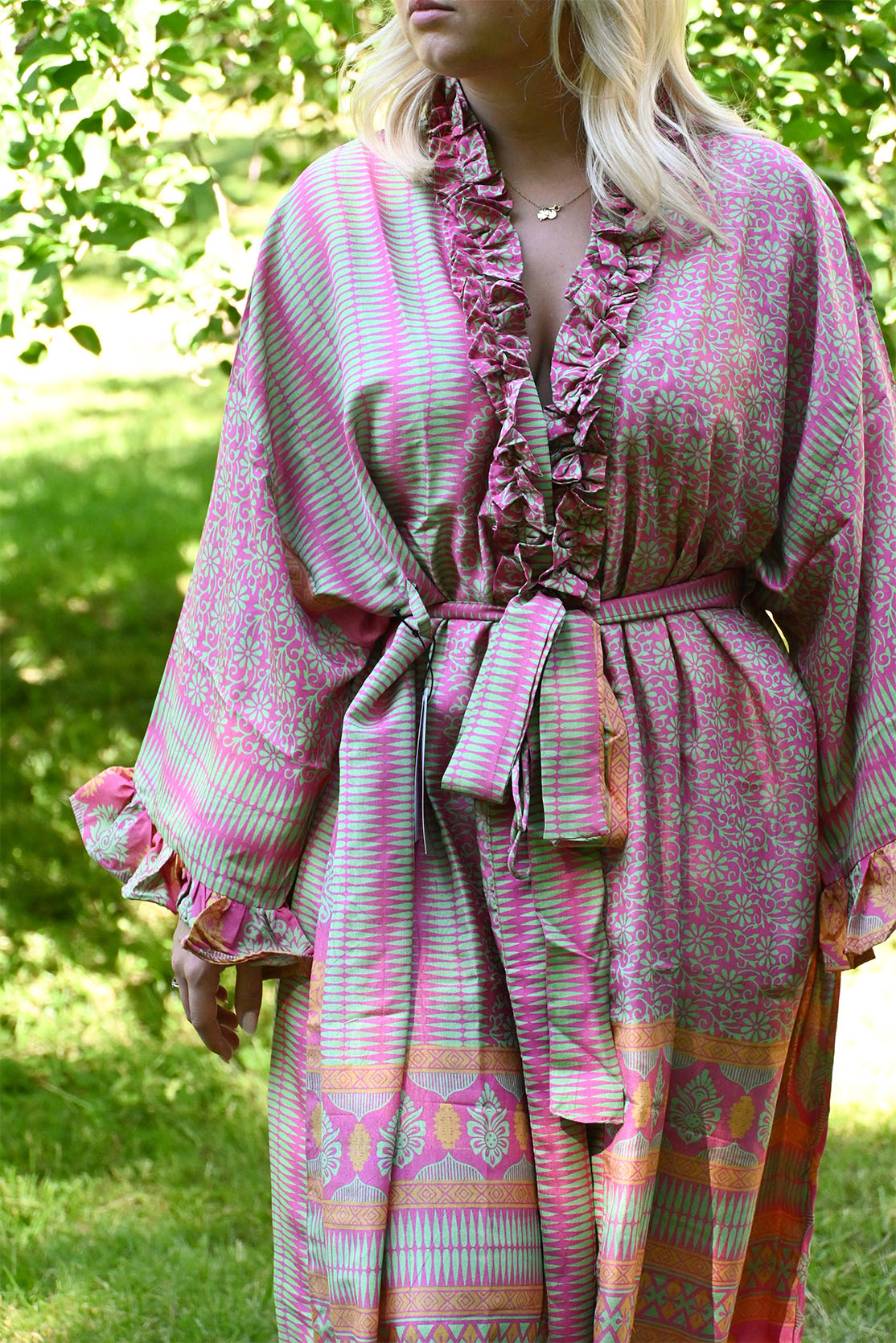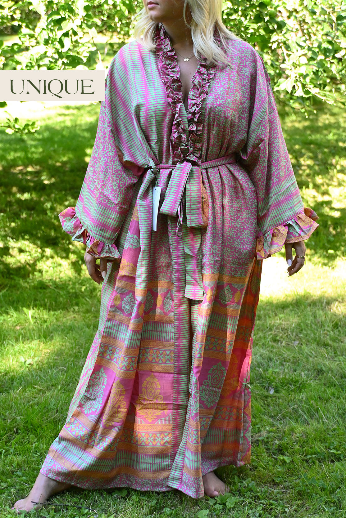 Våran underbara morgonrocks modell Pion är gjorda av återbrukat tyg från indiska saris. Detta gör att plaggen är unika och det finns bara en.