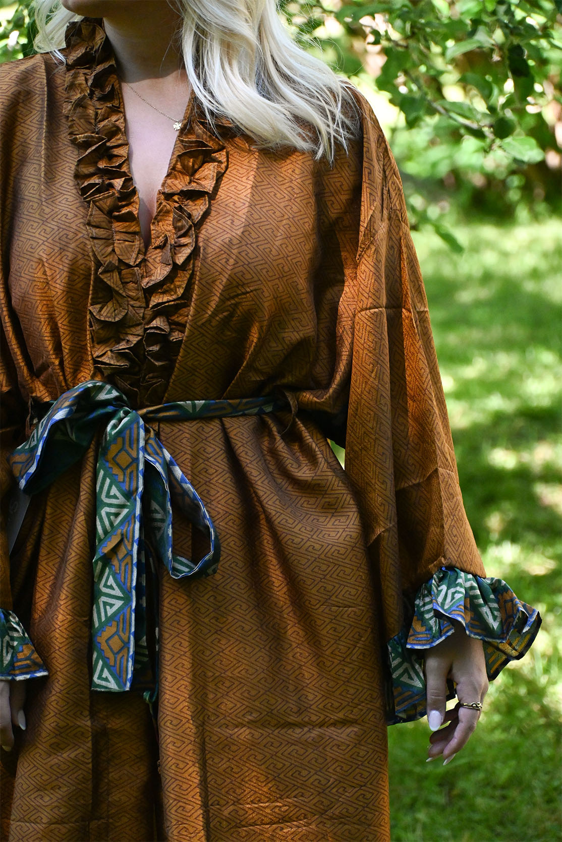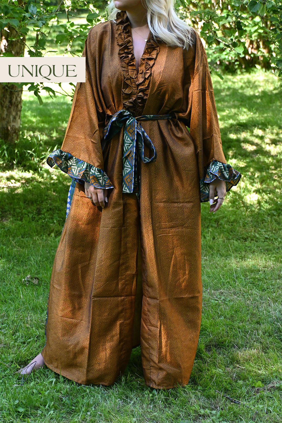 Våran underbara morgonrocks modell Pion är gjorda av återbrukat tyg från indiska saris. Detta gör att plaggen är unika och det finns bara en.
