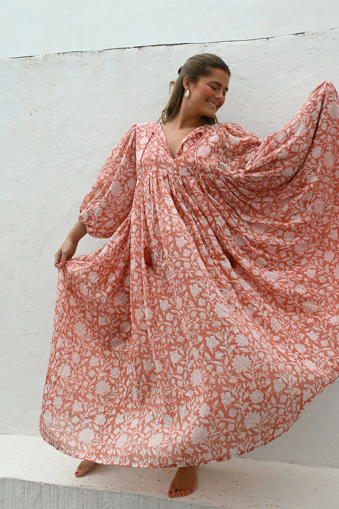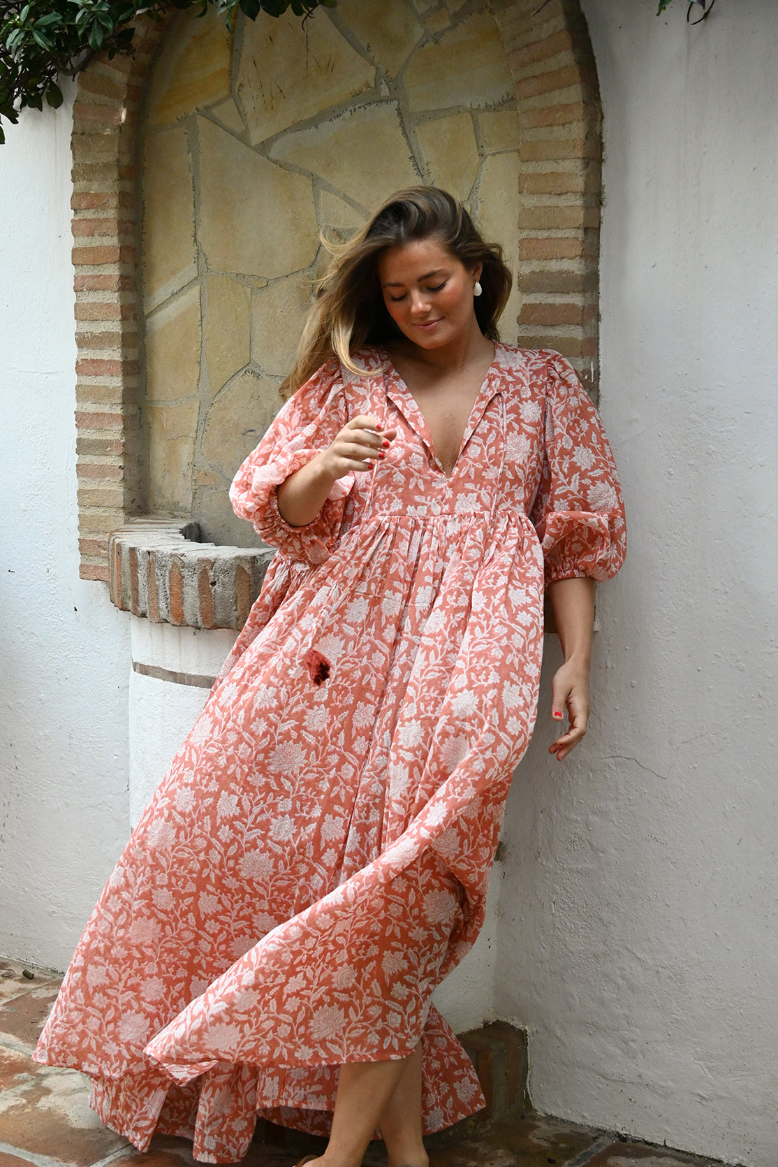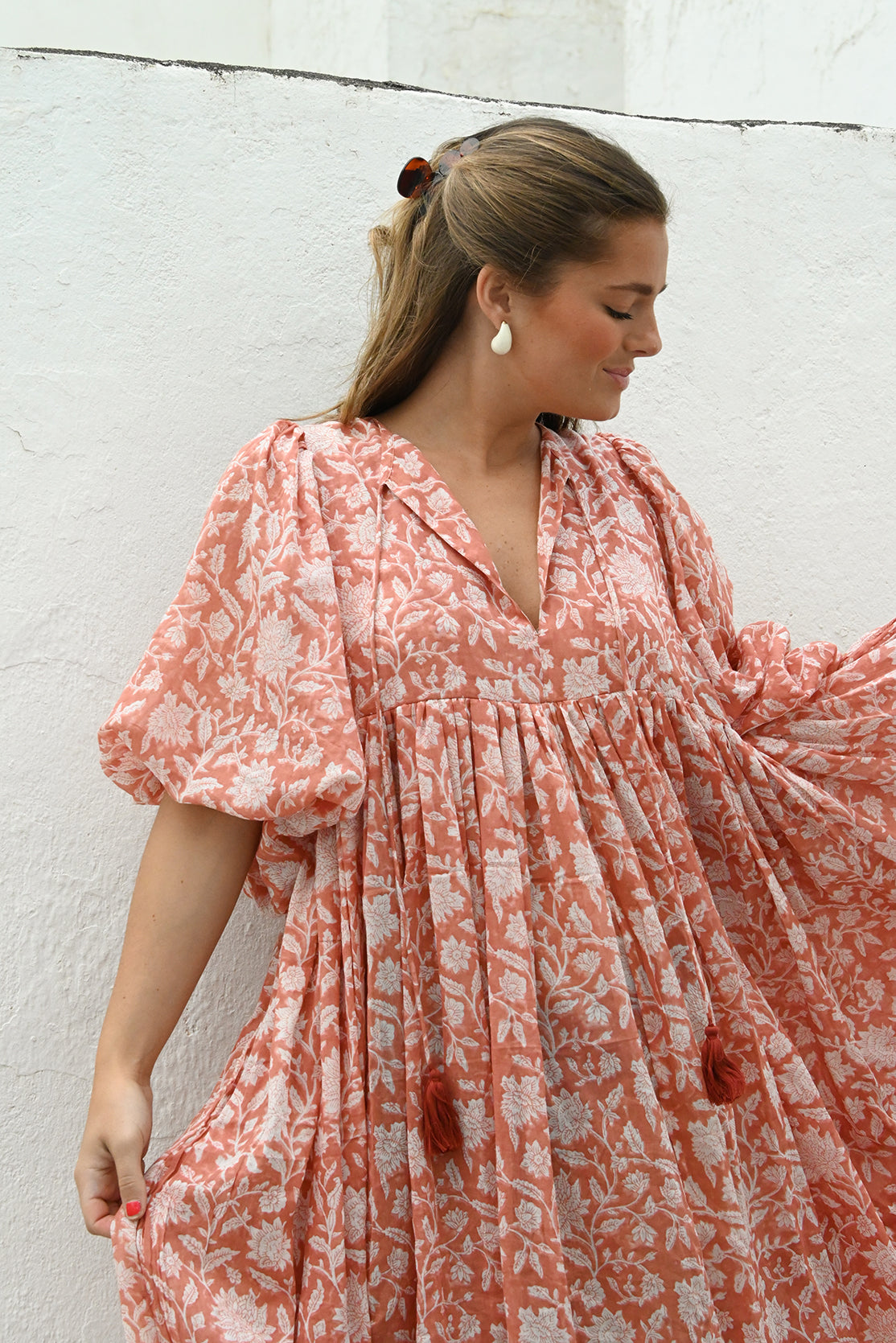 Rito är en tunn och luftig klänning som har medellånga puffärmar med resår vis ärmslutet och v-ringning med knytband.