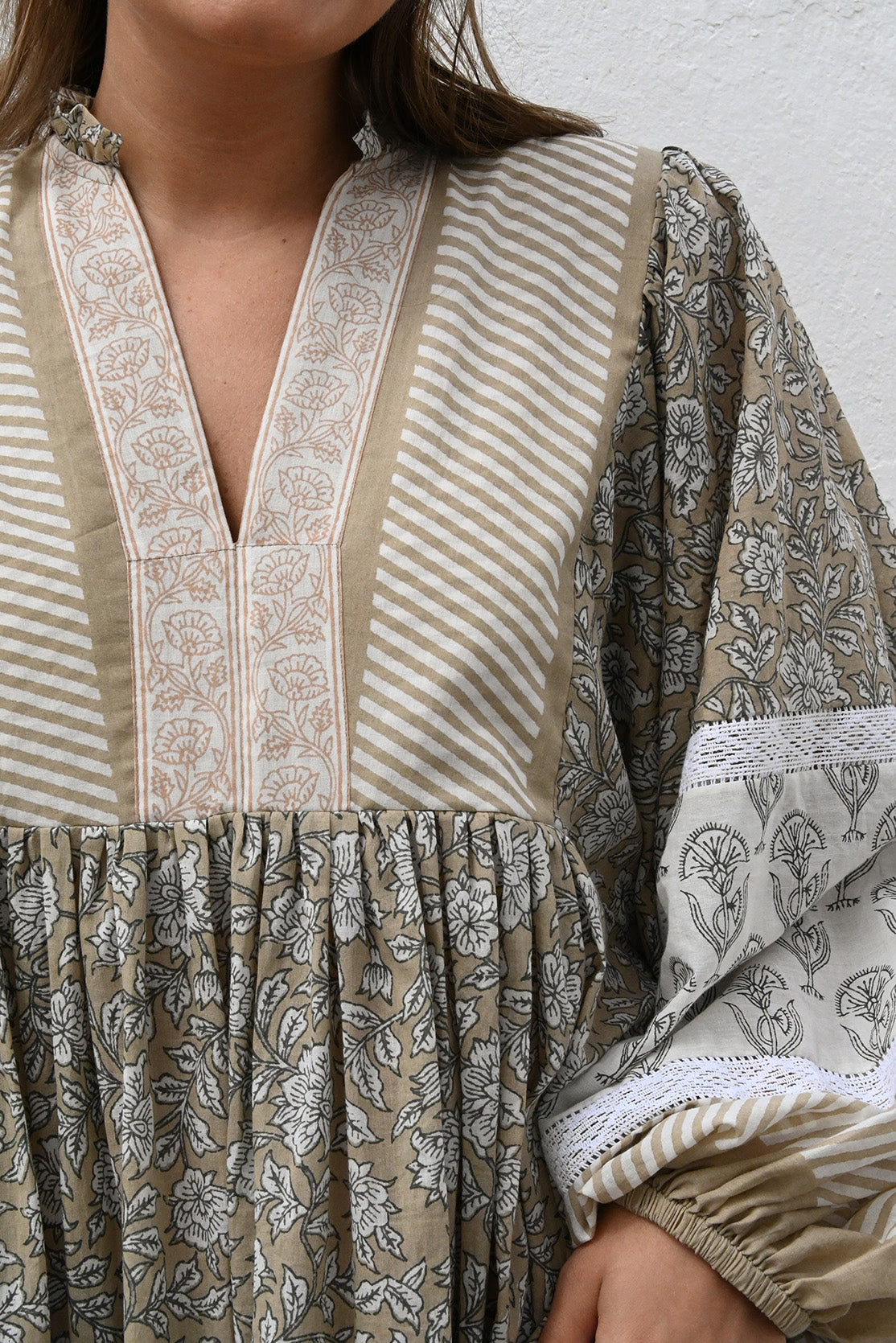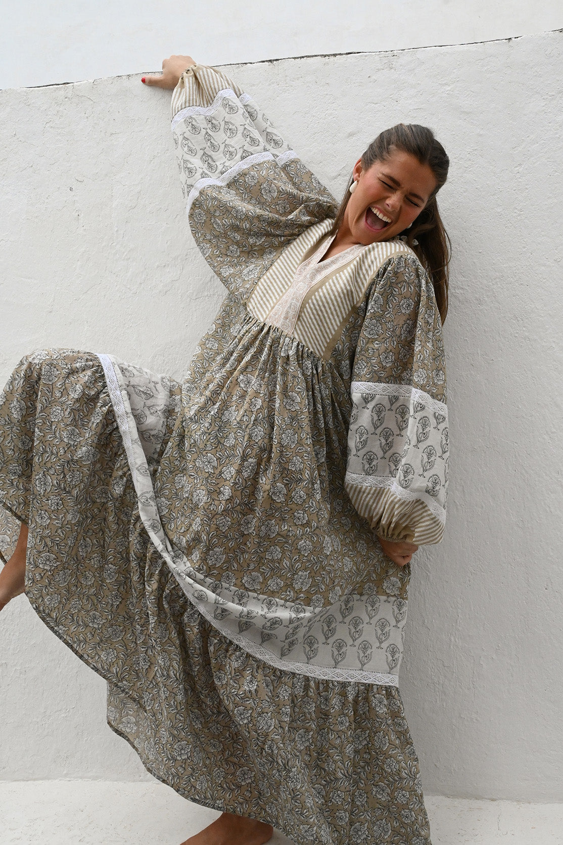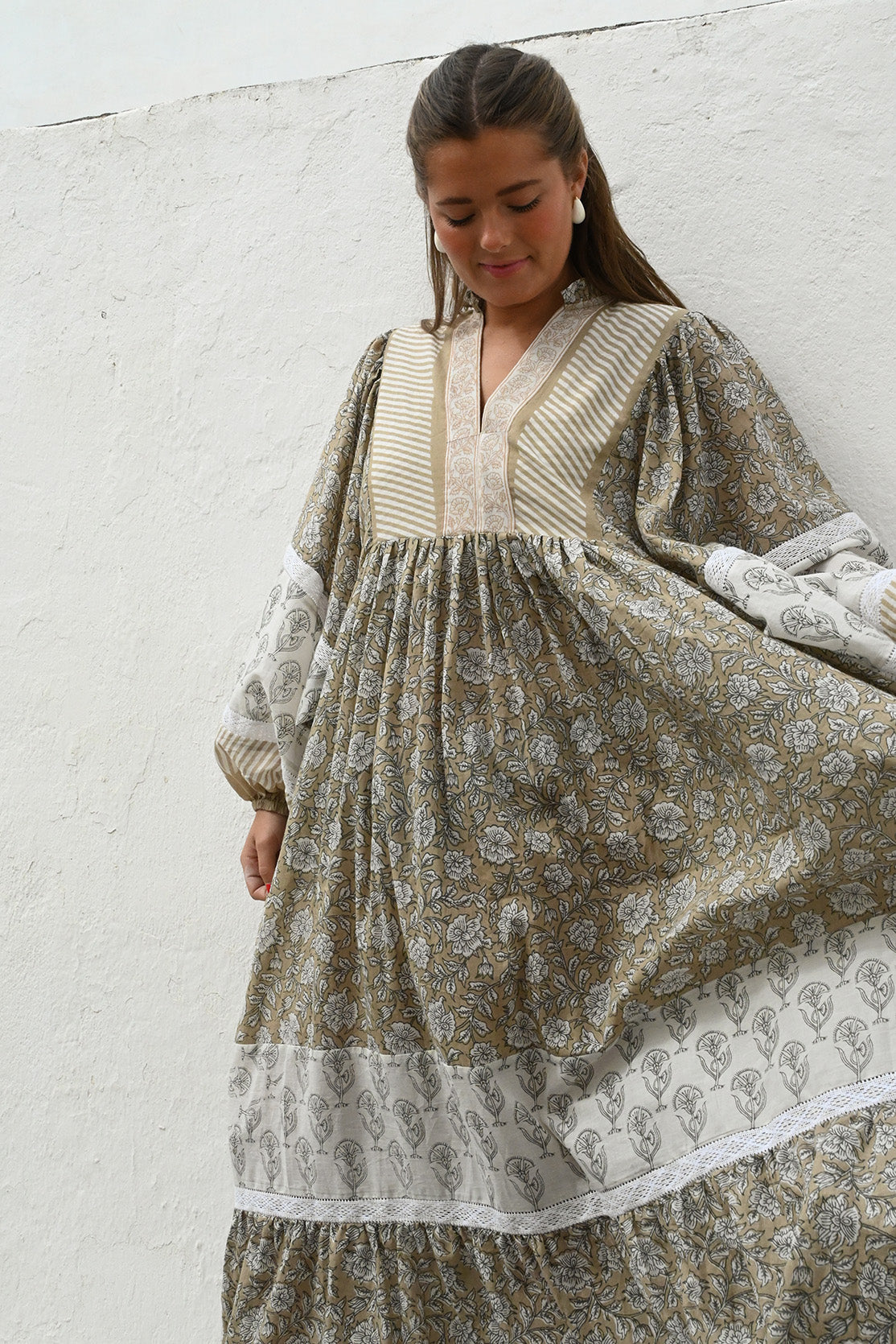 Shreeja är en lång klänning med en volang nertill och volanger vid halsringningen, klänningen har en rymlig puffärm med resår vid ärm öppningen och härliga spetsdetaljer vid ärmarna och vid volangen nertill.